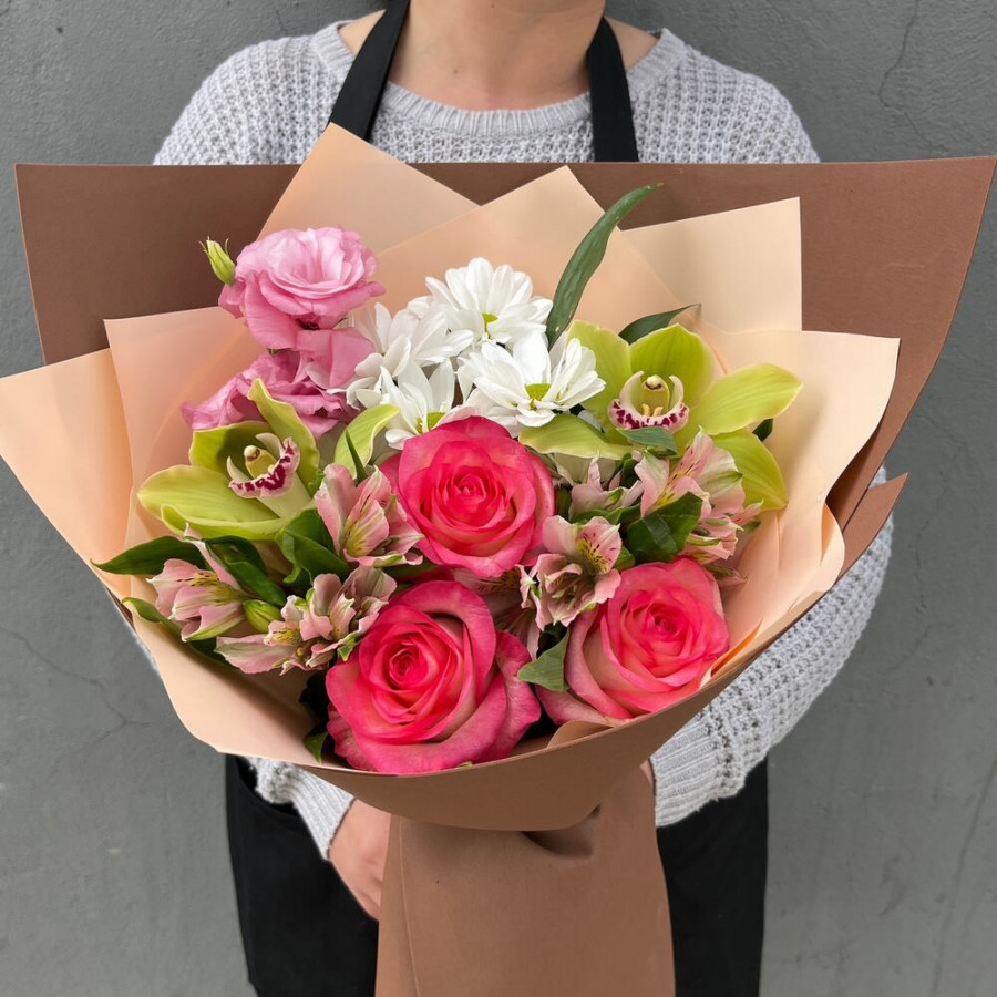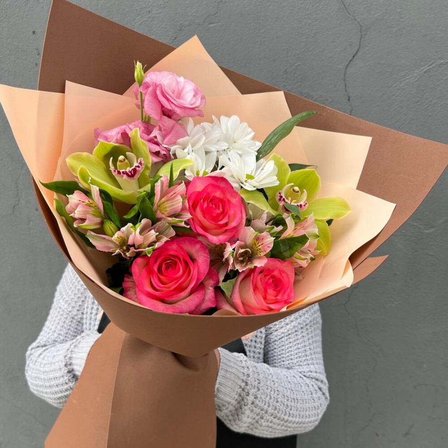На фото букет «гармония орхидей». В составе: альстромерия 2 шт, орхидея 2 шт, роза 3 шт, хризантема кустовая 1 шт, эустома (лизиантус) 1 шт, дизайнерская упаковка 1 шт, атласная лента 1 шт, . Все цветы свежие и ароматные, букет красиво оформлен и отлично подходит для подарка. Доступна доставка цветов или самовывоз.